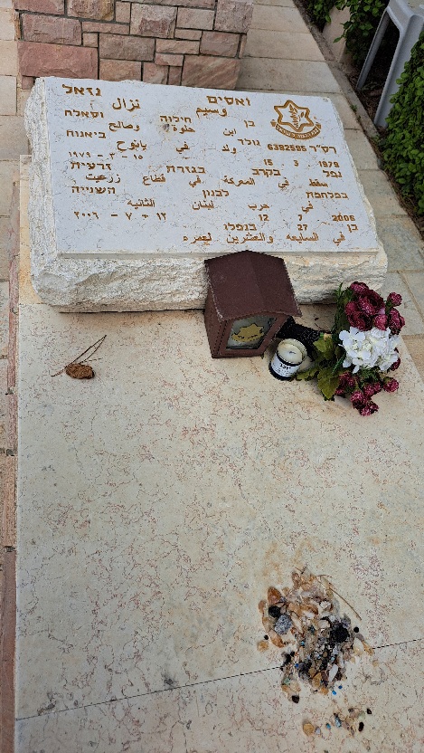 Left: Tombstone of Wasim Nazal, 25. married and father to a 2-year-old son, who who was abducted and killed with several other soldiers by Hezbollah on the Lebanese border on July 25th, 2006, an event that triggered the onset of the Second Lebanese War. Right: a collective monument at Yanuh-Jat cemetery