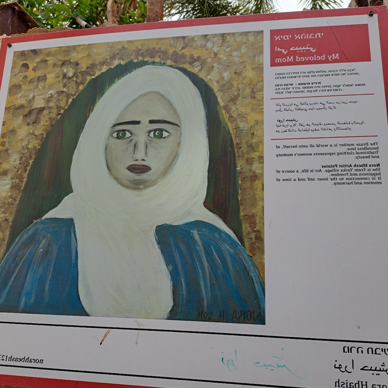 Artist Nora Habish depicted her mother as a model for the all-loving Druze woman. Her chaste traditional dress prepresents woman’s modesty and beauty. Black and blue are women’s traditioanl colors.